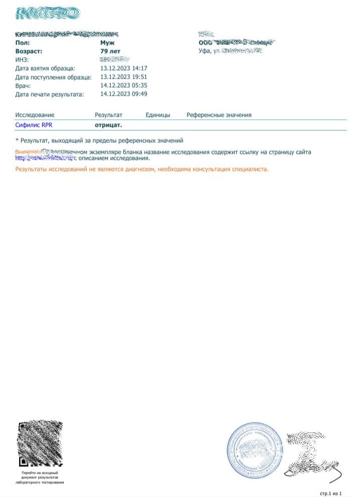 Образец справки Анализ крови на сифилис (RW, реакция Вассермана)